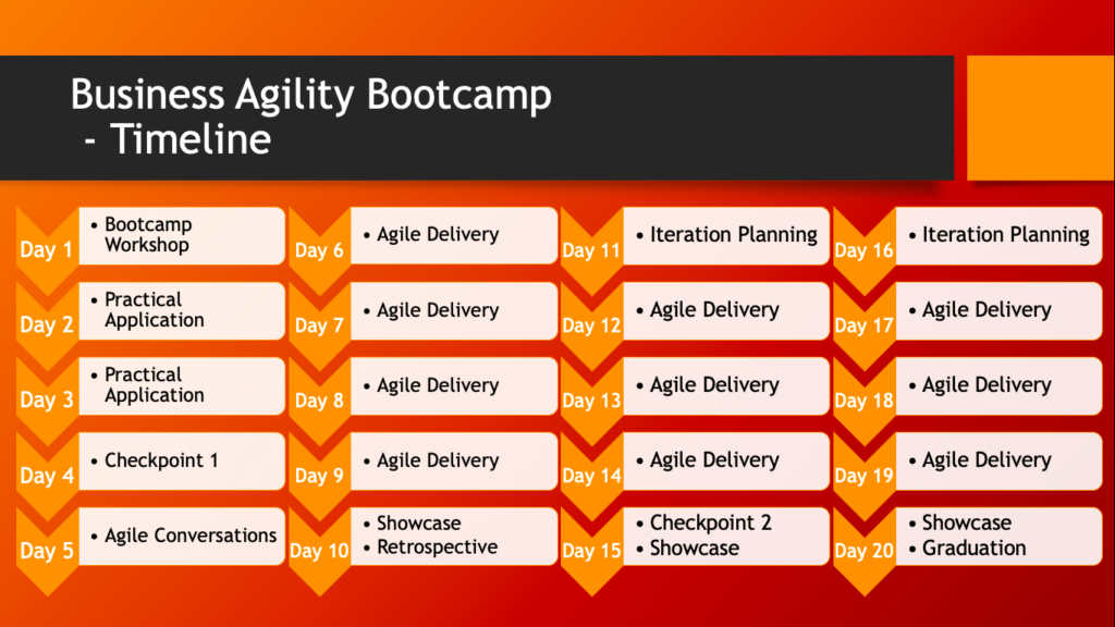 After four tough weeks in the Business Agility Bootcamp the participants have built their fitness, learned the key principles, attitudes, behaviours and practices of an Agile Delivery Practitioner. They will have mastered the key tools, and know how to set up and run the key conversations.